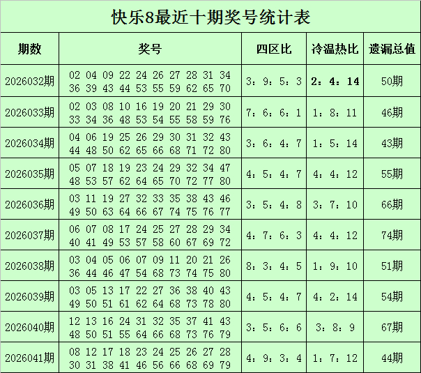 福彩快乐8第2026041期开奖回顾:08 12 17 18 23 24 25 26 27 28 30 31 38 41 46 56 66 68 69 79,其中奖号四区比为4:9:3:4,冷温热码比为1:7:12,遗漏总值为44。