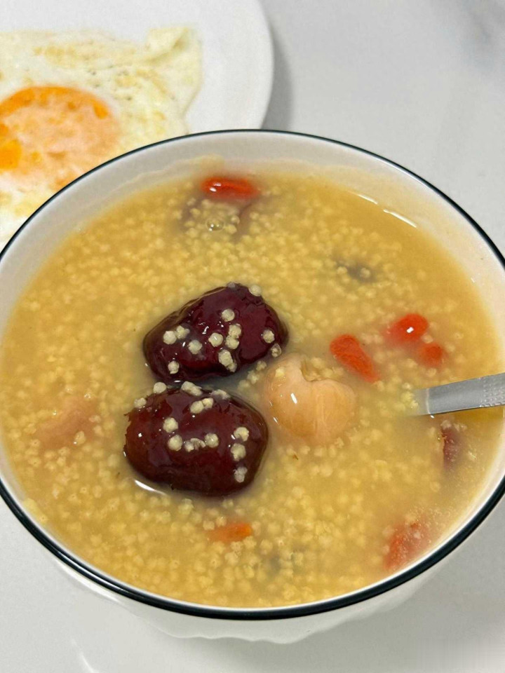 抓一把小米,大概两小把,用清水轻轻淘两遍。锅里添上三四碗水,烧开,再把小米倒进去。等水再滚起来,就调成小火,慢慢熬个一刻钟。这期间别忘了用勺子搅一搅,省得粘锅。接着,放几颗洗干净、去核切开的红枣,再加几粒桂圆肉,继续咕嘟十来分钟。