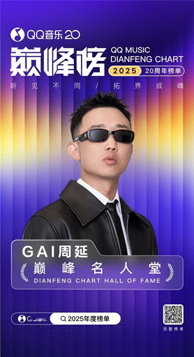 (新娱在线讯www.onyule.com)1月9日,QQ音乐官方发布2025#QQ音乐巅峰榜年度榜单#,种梦音乐D.M.G旗下艺人GAI周延与陈奕迅、蔡依林、G.E.M邓紫棋、方大同、凤凰传奇、李荣浩、林俊杰、林宥嘉、孙燕姿、陶喆、王力宏、汪苏泷、王菲、五月天、薛之谦、许嵩、张靓颖、周深、周杰伦共计二十位华语乐坛顶级唱将共同登上QQ音乐20周年榜单「巅峰名人堂」。“这二十年,他们以作品雕刻时代,平台因他们而充满回响。这份榜单,是我们共同旅程的有声丰碑。”